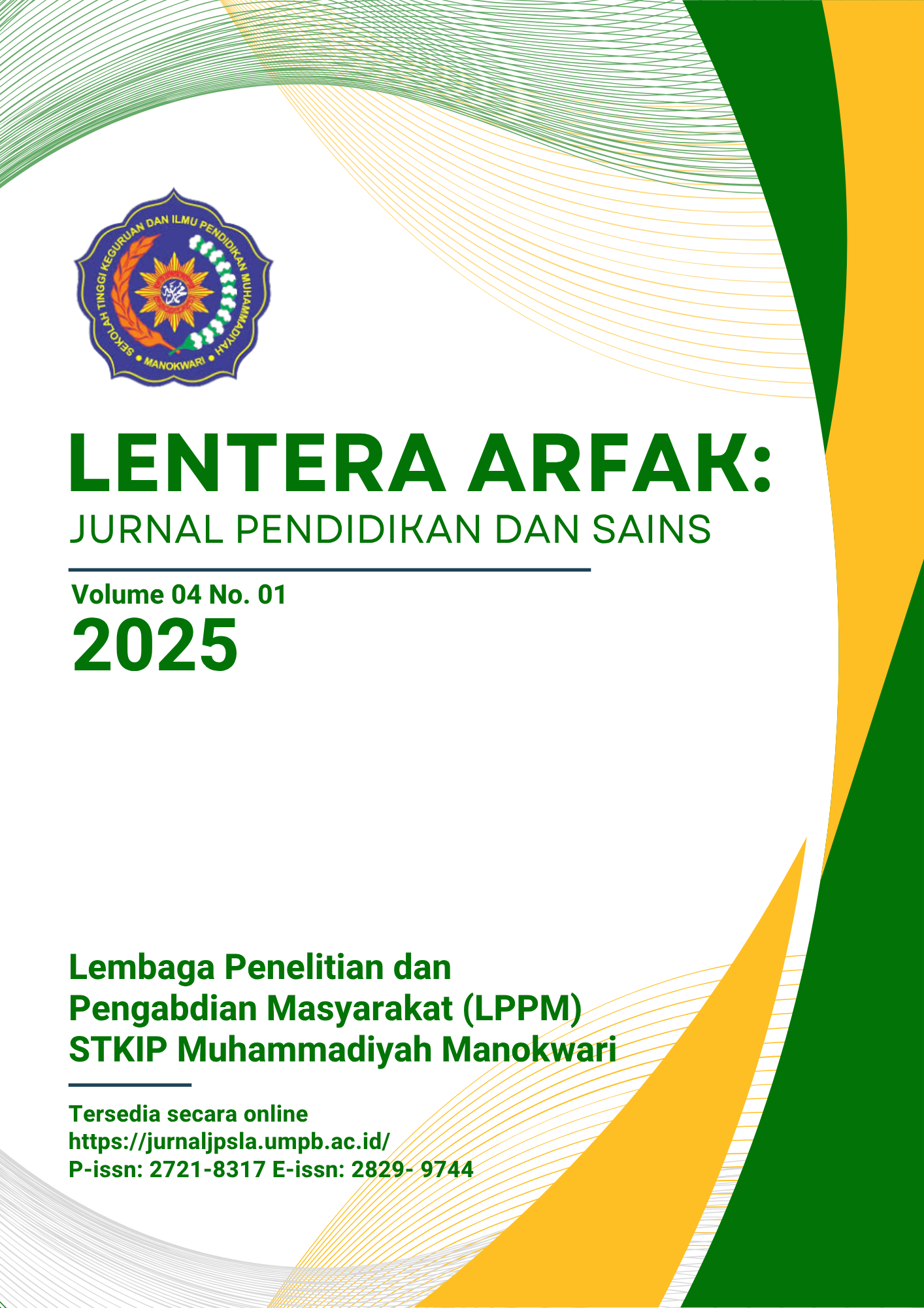 Vol. 4 No. 1 (2025)Lentera Arfak: Jurnal Pendidikan dan Sains, edisi 4, nomor 1, tahun 2025, menerbitkan sepuluh makalah dari beragam penulis dan instansi, yang mencakup kontribusi dari berbagai negara. Pada edisi ini, tren penelitian berkisar pada penerapan teknik inovatif dalam pendidikan. Tema utama meliputi peningkatan keterampilan menyimak melalui teknik dengar-cerita bergambar dan pemanfaatan obat tradisional dalam konteks pendidikan biologi untuk meningkatkan kesadaran kesehatan. Selain itu, terdapat penelitian mengenai strategi guru dalam membangun karakter disiplin siswa dan analisis kesalahan dalam menyelesaikan soal matematika. Temuan ini memberikan perspektif baru dan berharga bagi kemajuan pendidikan.